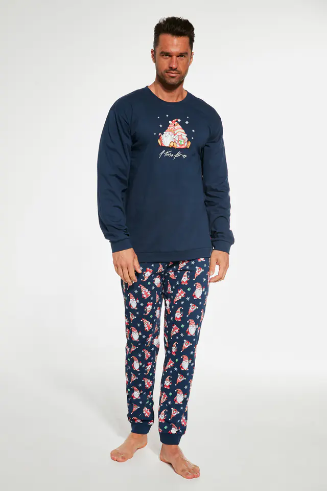 Piżama świąteczna uszyta z wysokiej jakości bawełny. Koszulka z długim rękawem, przód ozdobiony kolorowym nadrukiem. Do kompletu długie wzorzyste spodnie. Dekolt, mankiety oraz dół koszulki z nogawki zakończone wygodnym ściągaczem.Skład: 100% bawełna.