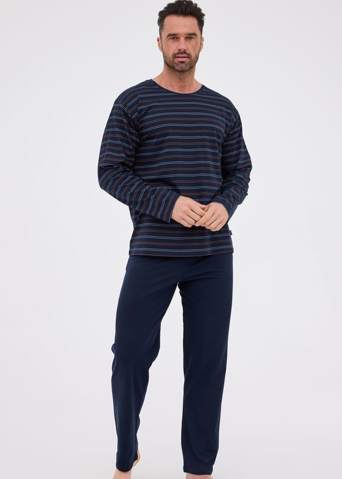 Piżama męska z wysokiej jakości bawełny.Koszulka z długim rękawem w paski, dekolt okrągły. Spodnie z długą nogawką, jednolite. Skład: koszulka 90% bawełna, 10% poliester; spodnie 100% bawełna.