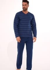 Piżama męska z wysokiej jakości bawełny. Koszulka z długim rękawem w paski, dekolt w szpic. Spodnie długie, proste, gładkie. Skład: koszulka- 80% bawełna, 20% poliester, spodnie- 100% bawełna.