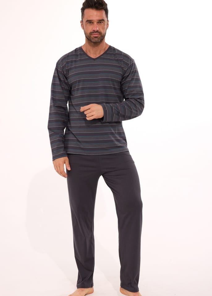 Piżama męska z wysokiej jakości bawełny. Koszulka z długim rękawem w paski, dekolt w szpic. Spodnie długie, proste, gładkie. Skład: koszulka- 80% bawełna, 20% poliester, spodnie- 100% bawełna.