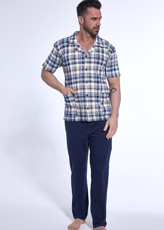 Rozpinana piżama męska z wysokiej jakości bawełny. Bluzka w kratkę, z krótkim rękawem, kołnierzykiem i kieszeniami, zapinana na guziki. Spodnie długie, proste, jednolite. Skład: 100% bawełna.
