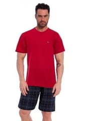 Piżama męska z wysokiej jakości oddychającej bawełny. Koszulka z krótkim rękawem z małą aplikacją na piersi. W komplecie krótkie spodenki w kratkę. Luźny krój. Pakowana w woreczek foliowy. Skład: 100% bawełna.