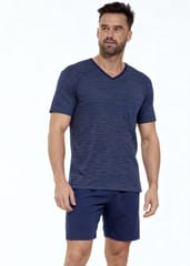 Bawełniana piżama męska. Koszulka w paski z krótkim rękawem i dekoltem w szpic. Do kompletu jednolite, krótkie spodenki. Skład: koszulka 85% bawełna,15% poliester; spodnie 100% bawełna.