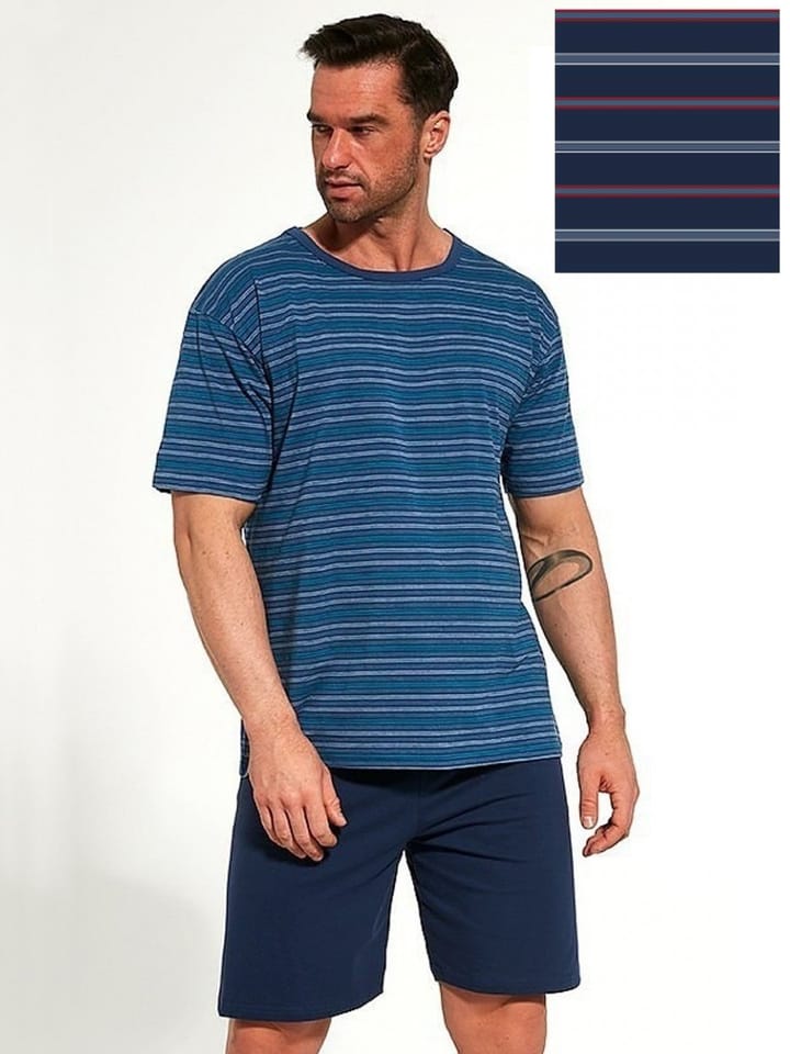 Bawełniana piżama męska. Koszulka w paski, z krótkim rękawem, dekolt okrągły, jednolite szorty. Skład: koszulka 85% bawełna, 15% poliester; spodnie 100% bawełna.