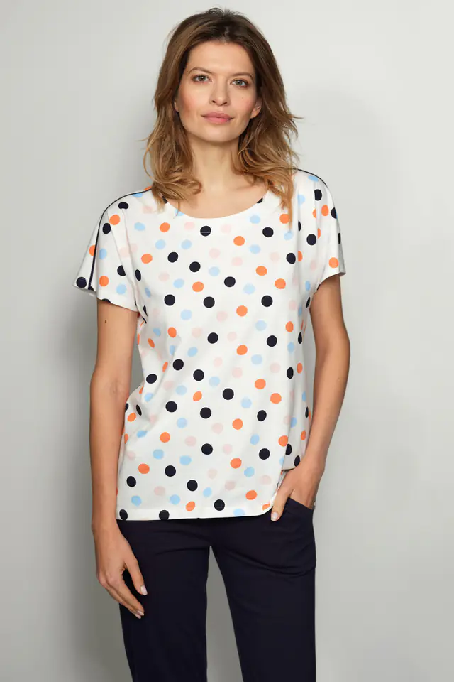 Piżama damska wykonanana z wysokiej jakości bawełny. Koszulka w urocze grochy z krótkim, luźnym rękawem. Do kompletu spodnie o długości 7/8, jednokolorowe z ciekawymi rozcięciami na dole nogawek.