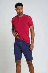 Czerwono-granatowa piżama męska z lekko dopasowaną koszulką zapinaną pod szyją na guziki i bardzo modnymi spodniami do kolan. Spodnie gładkie, z widoczną, drukowaną gumą w pasie. Jeśli i Ty stawiasz na ciekawy, modny wygląd a przy tym zależy Ci na niezbędnej wygodzie - oto idealna propozycja dla Ciebie. Skład: góra 80% bawełna, 20% poliester, dół 100% bawełna.