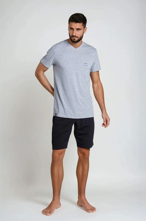 Kto lubi gładkie piżamy w dobrej kolorystyce trafił doskonale. Duty - najnowsza piżama marki Henderson stawia na wygodny krój i dobrze dobrane barwy. T-shirt wyróżnia się subtelnym V-dekoltem a na piersi możesz dostrzec mały napis. W zestawie gładkie, czarne spodnie do okolic kolan. Luz i komfort na lato! Skład: góra 88% bawełna, 12% poliester, dół 100% bawełna.