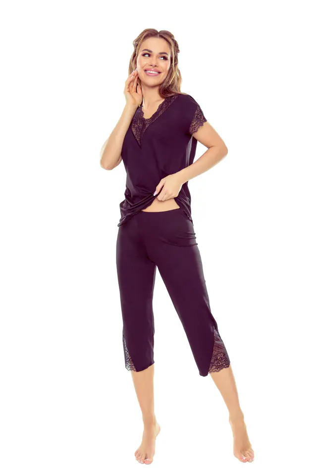 Piżama damska wykonana z wysokiej jakości materiału, ozdobiona wstawkami z koronki. Krótki rękaw, spodnie rybaczki.