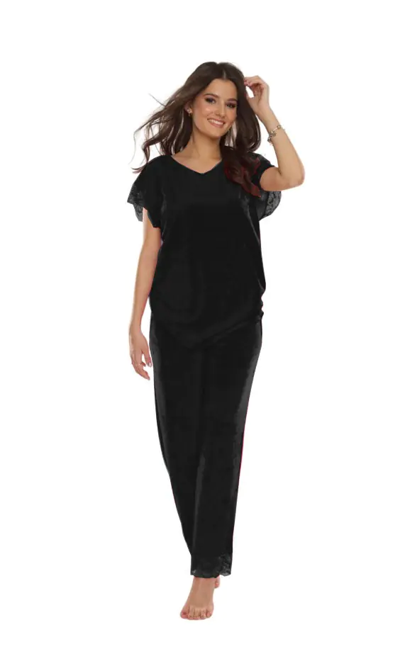 Piżama damska wykonana z weluru, koszulka z krótkim, koronkowym rękawkiem. Długie spodnie z kieszeniami, nogawki obszyte koronką. Skład: 77% bambus, 23% poliester.
