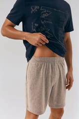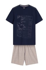 Piżama męska z wysokiej jakości bawełny. Koszulka z krótkim rękawem, półokrągłym dekoltem i delikatną aplikacją z przodu. Spodenki krótkie, jednolite, w pasie guma. Skład: 100% bawełna.