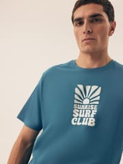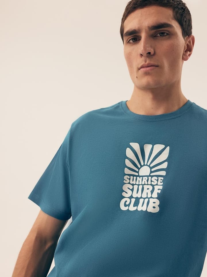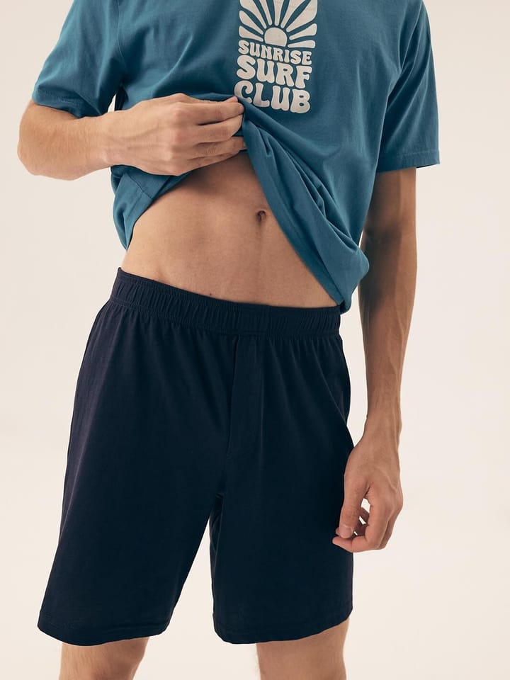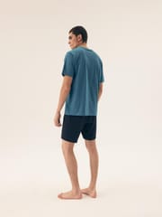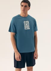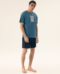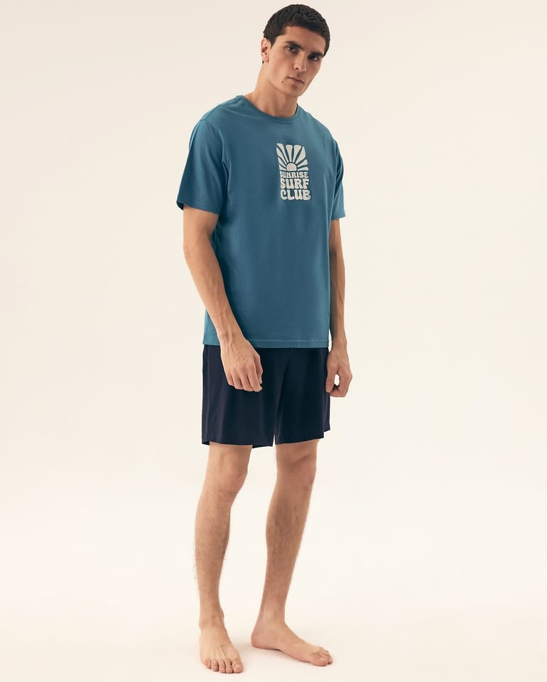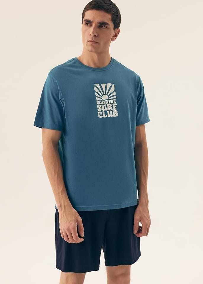 Bawełniana piżama męska. Koszulka z krótkim rękawem, okrągłym dekoltem i nadrukiem z przodu. Spodenki jednolite do kolan z elastyczną gumką w pasie. Skład: 100% bawełna.