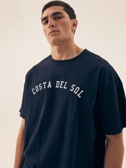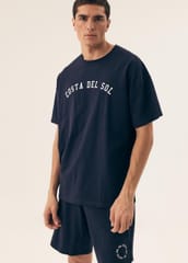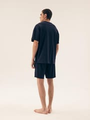 Bawełniana piżama męska. Koszulka z krótkim rękawem, okrągłym dekoltem i nadrukiem z przodu. Spodenki luźne, jednolite do kolan, na nogawce mały nadruk. Elastyczna gumka w pasie. Skład: 100% bawełna.