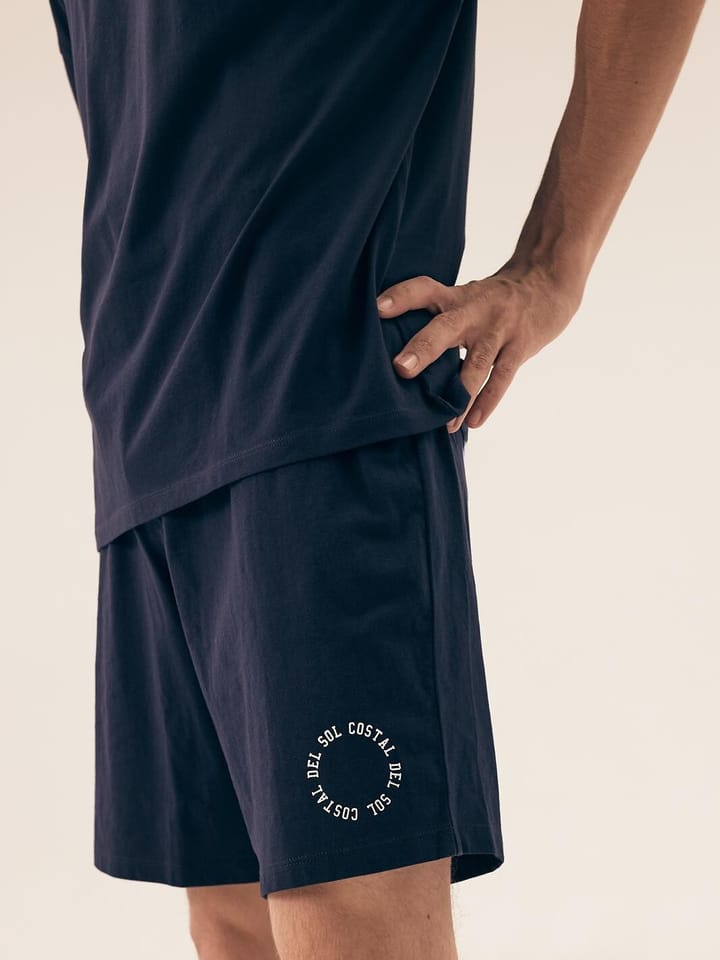 Bawełniana piżama męska. Koszulka z krótkim rękawem, okrągłym dekoltem i nadrukiem z przodu. Spodenki luźne, jednolite do kolan, na nogawce mały nadruk. Elastyczna gumka w pasie. Skład: 100% bawełna.