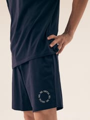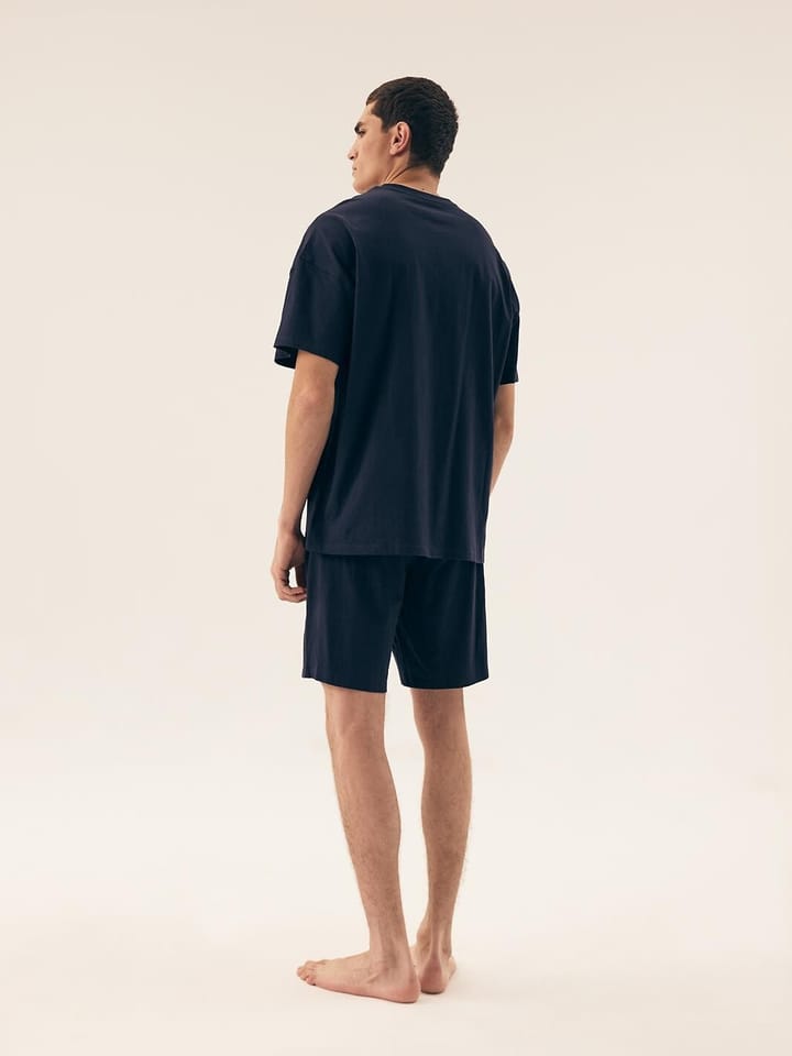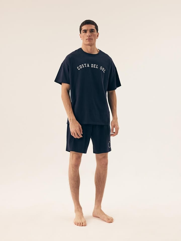 Bawełniana piżama męska. Koszulka z krótkim rękawem, okrągłym dekoltem i nadrukiem z przodu. Spodenki luźne, jednolite do kolan, na nogawce mały nadruk. Elastyczna gumka w pasie. Skład: 100% bawełna.