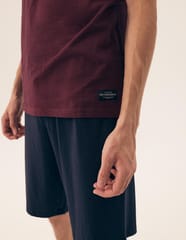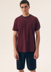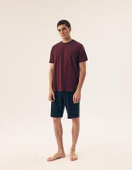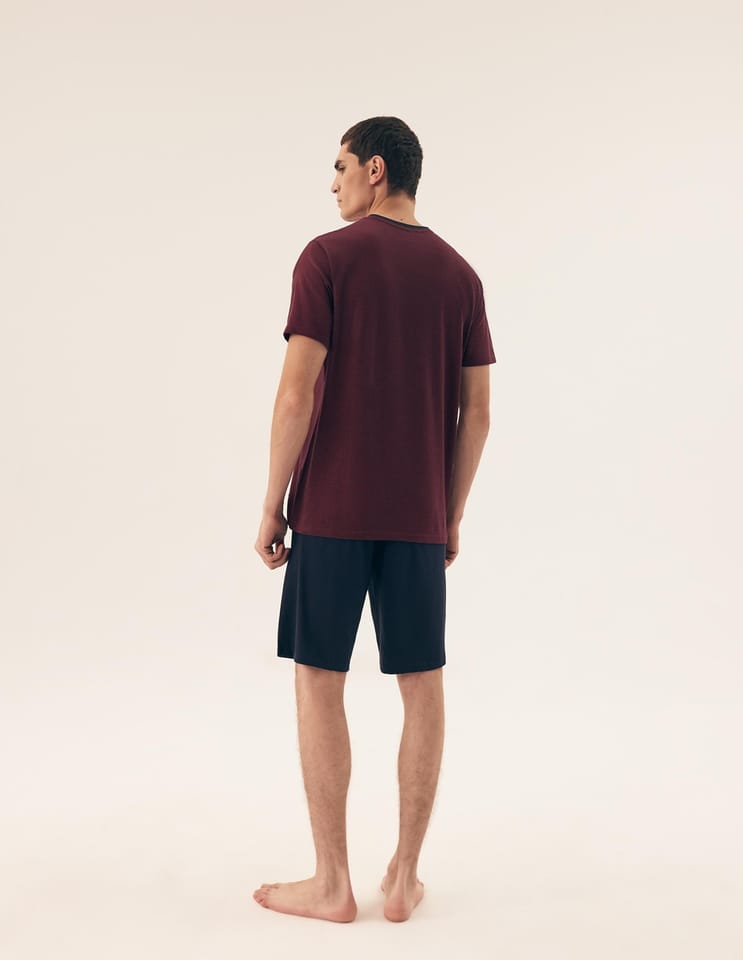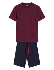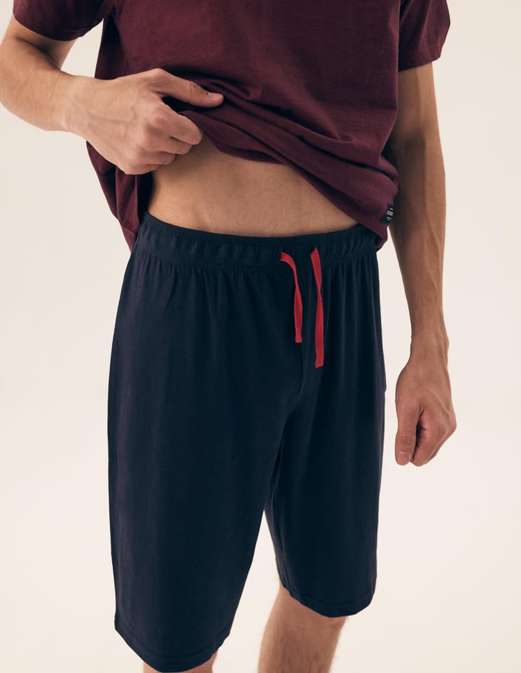 Bawełniana piżama męska z krótkim rękawem. Koszulka z okrągłym dekoltem we wzór w drobne paski. Spodenki jednolite z elastyczną gumką w pasie, wiązane na troczek do regulacji obwodu, długość do kolan. Skład:100% bawełna.