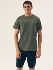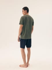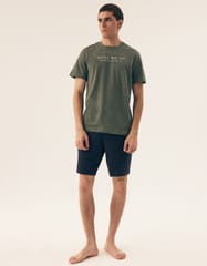 Piżama męska z wysokiej jakości bawełny. Koszulka z krótkim rękawem, półokrągłym dekoltem i delikatną aplikacją. Spodenki krótkie z dzianiny o strukturze"wafla", w pasie gumka i sznureczek.Skład: koszulka 100% bawełna; spodenki 88% bawełna, 12% poliester.