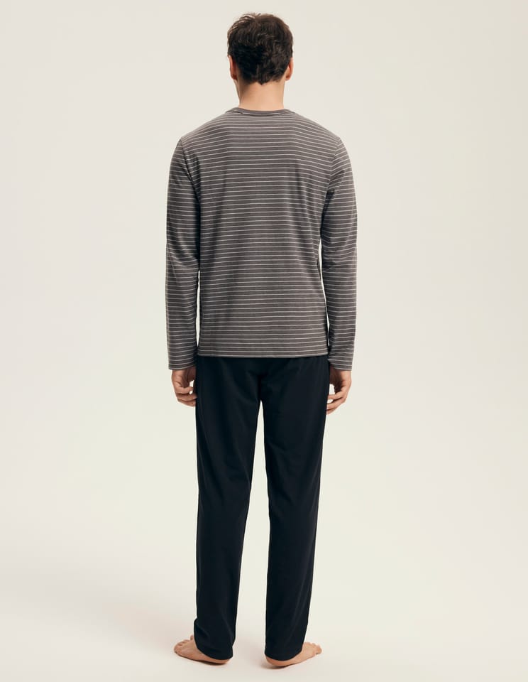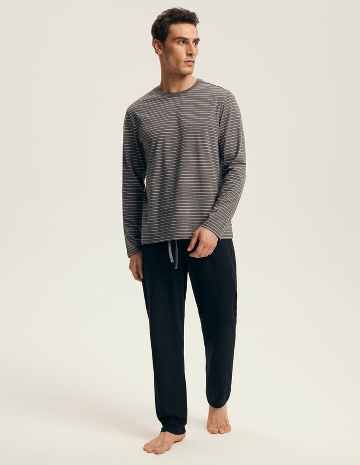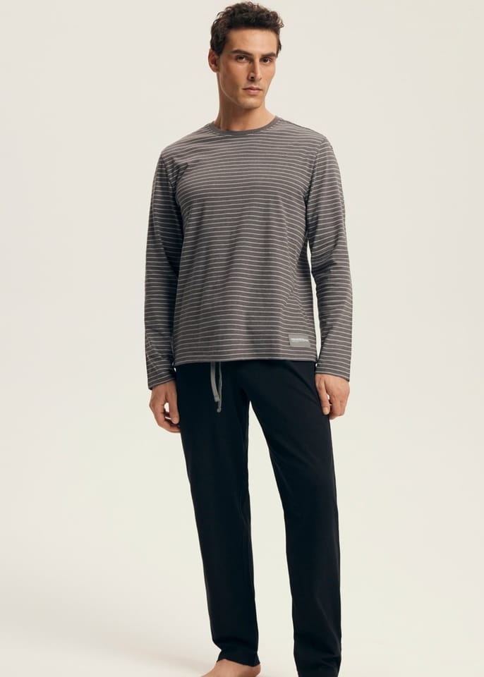 Bawełniana piżama męska. Bluza z długim rękawem i okrągłym dekolotem, ozdobiona delikatnymi paskami. Do kompletu długie, jednolite spodnie. Skład: Góra: 60% bawełna, 40% poliester, Gół: 100% bawełna.