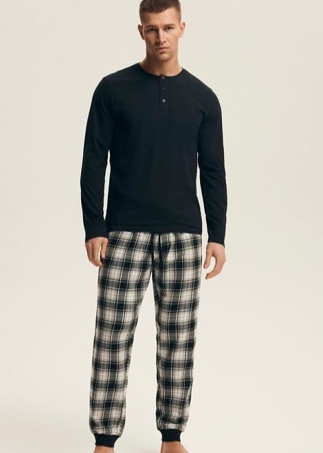 Bawełniana, ciepła piżama męska. Koszulka gładka z długim rękawem i okrągłym dekoltem zapinanym na guziki. Do kompletu długie, luźne spodnie w kratkę z flaneli. Nogawki i pas zakończone ściągaczem. Skład: 100% bawełna.