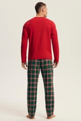 Piżama męska z wysokiej jakości bawełny. Koszulka z długim rękawem, przód ozdobiony świątecznym motywem. Do kompletu długie spodnie w kratkę z flaneli. Skład: 100% bawełna.