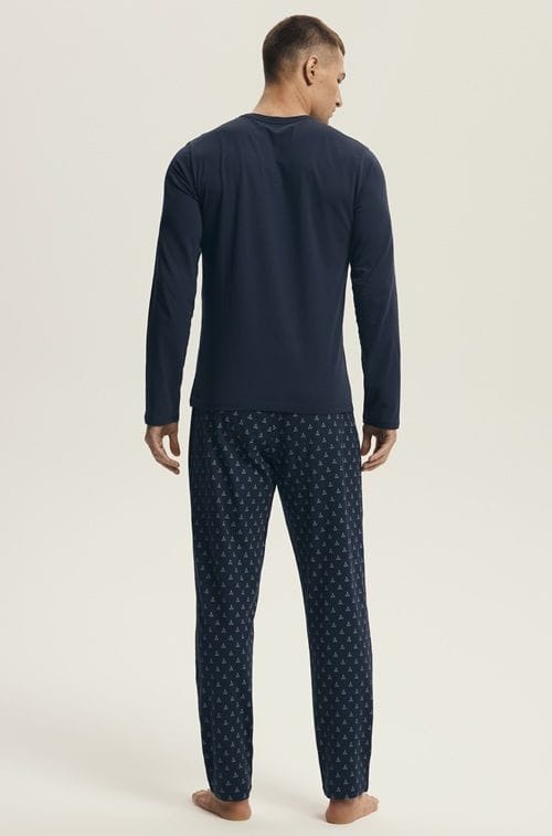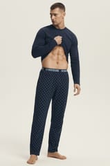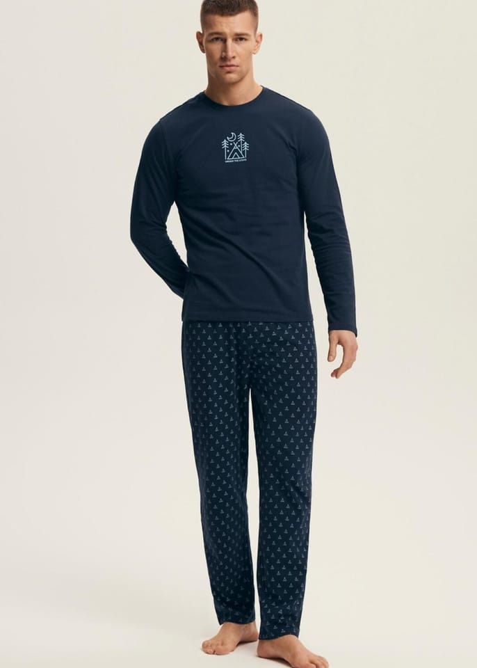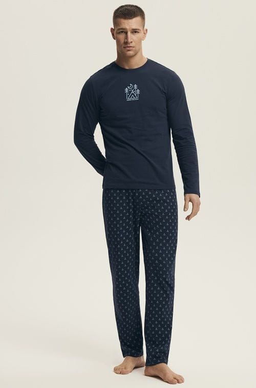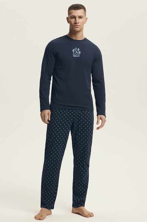 Bawełniana piżama męska. Bluza z długim rękawem i okrągłym dekolotem, z przodu mały nadruk. Do kompletu długie, wzorzyste spodnie. Skład: 100% bawełna.