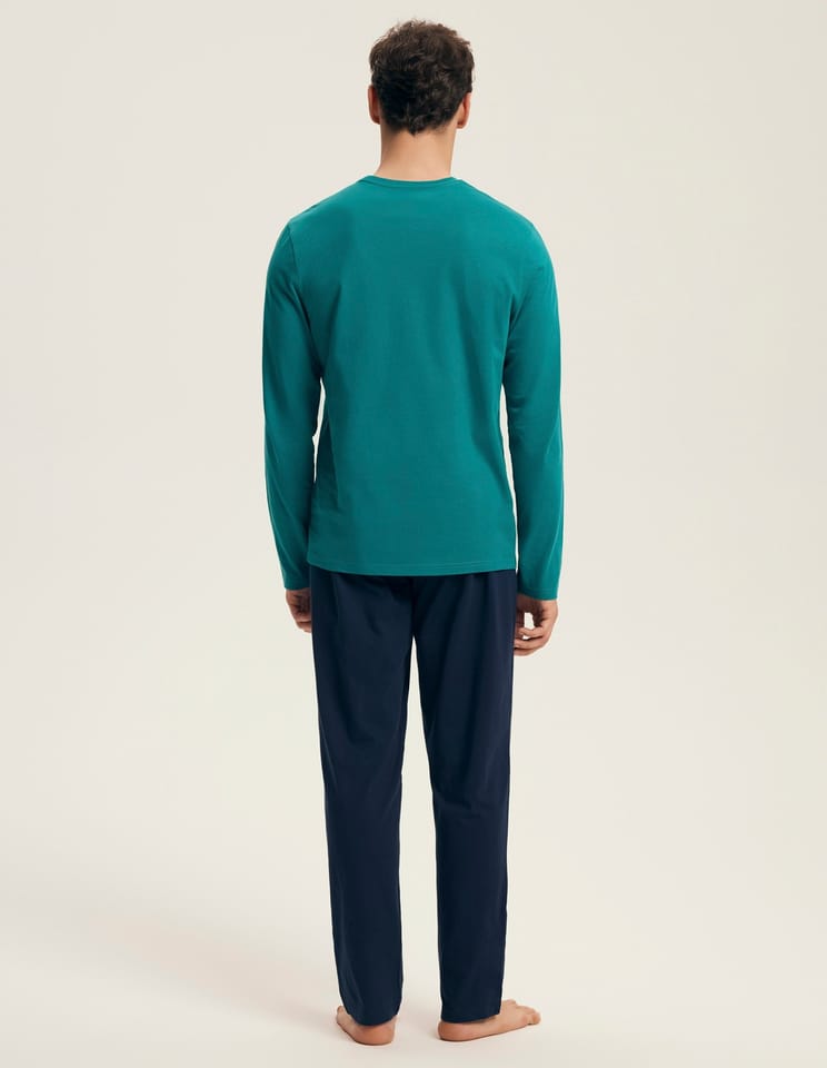 Piżama męska wykonana z wysokiej jakości bawełny. Bluzka z długim rękawem, ozdobiona napisem. Spodnie gładkie, proste, w kontrastującym kolorze. Skład: 100% bawełna.