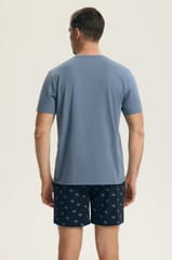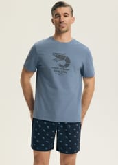 Bawełniana piżama męska zapewnia doskonałą przewiewność i komfort. Koszulka z krótkim rękawem, okrągłym dekoltem, z przodu ozdobiona nadrukiem. Spodenki wzorzyste, długość do kolan, w pasie elastyczna gumka. Skład: 100% bawełna