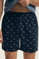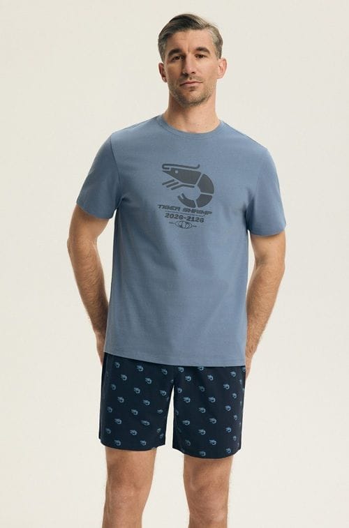 Bawełniana piżama męska zapewnia doskonałą przewiewność i komfort. Koszulka z krótkim rękawem, okrągłym dekoltem, z przodu ozdobiona nadrukiem. Spodenki wzorzyste, długość do kolan, w pasie elastyczna gumka. Skład: 100% bawełna
