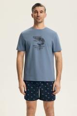Bawełniana piżama męska zapewnia doskonałą przewiewność i komfort. Koszulka z krótkim rękawem, okrągłym dekoltem, z przodu ozdobiona nadrukiem. Spodenki wzorzyste, długość do kolan, w pasie elastyczna gumka. Skład: 100% bawełna