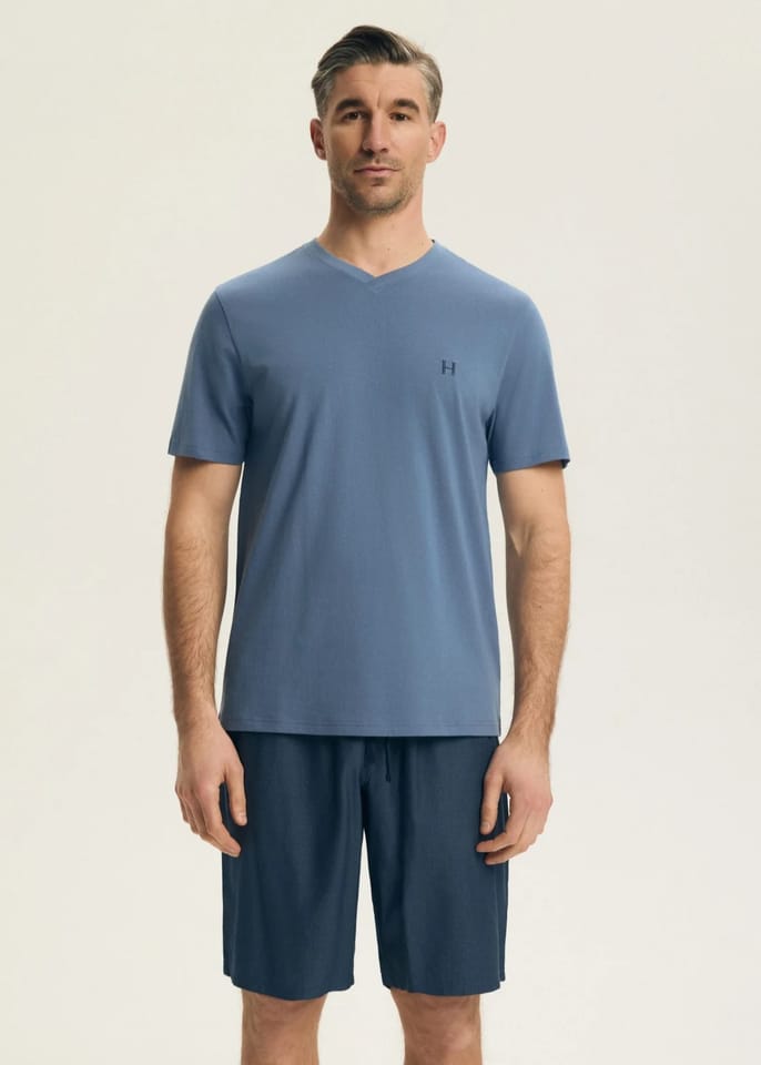 Męska piżama z miękkiej i oddychającej bawełny. Koszulka z dekoltem w szpic i z krótkim rękawem.Spodenki jednolite, długość do kolan. Skład: 100% bawełna.