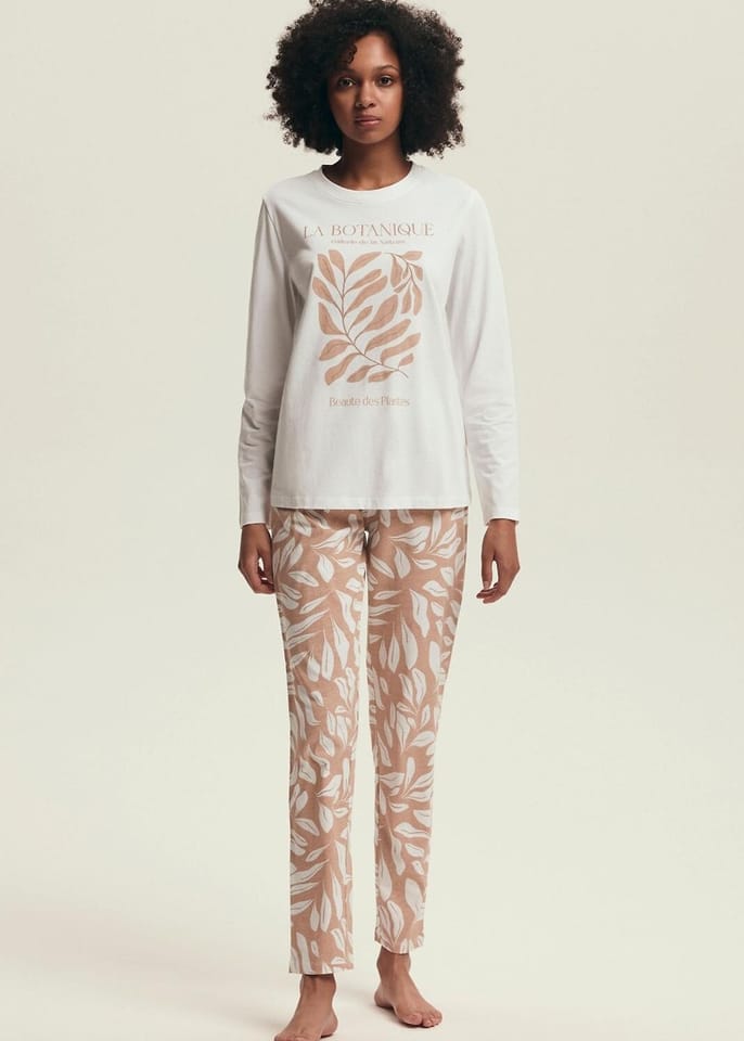 Bawełniana piżama damska z okrągłym dekoltem, przód ozdobiony nadrukiem. Do kompletu spodnie z roślinnym printem z szeroką, wygodną gumką w pasie. Skład: 100% bawełna.
