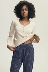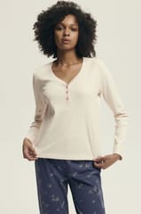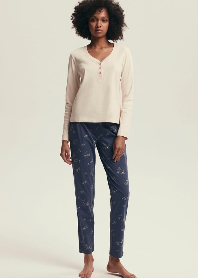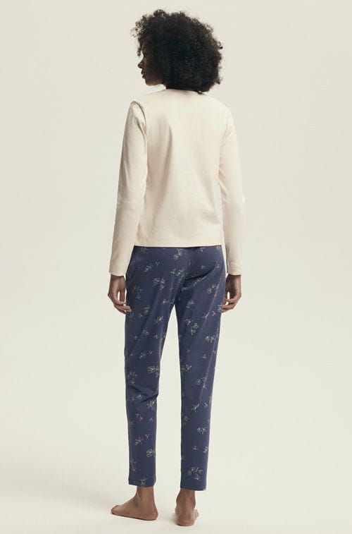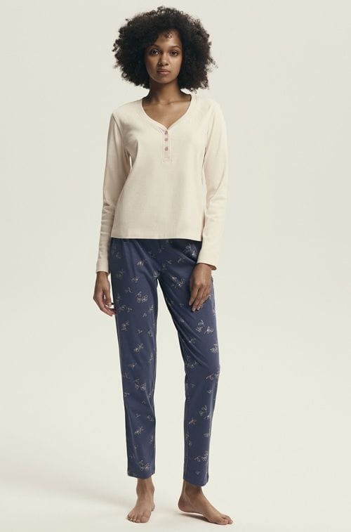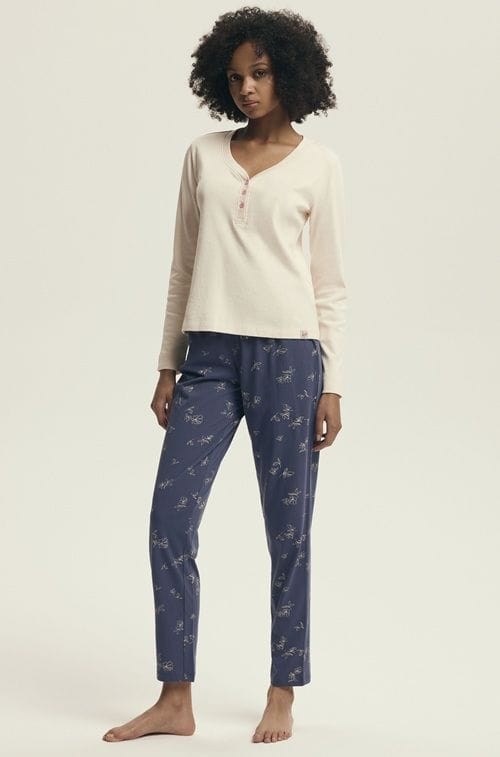 Bawełniana piżama damska w drobny prążek z dekoltem "V" zapinanym na guziczki. Do kompletu długie spodnie z roślinnym printem z szeroką, wygodną gumką w pasie. Skład: 100% bawełna.
