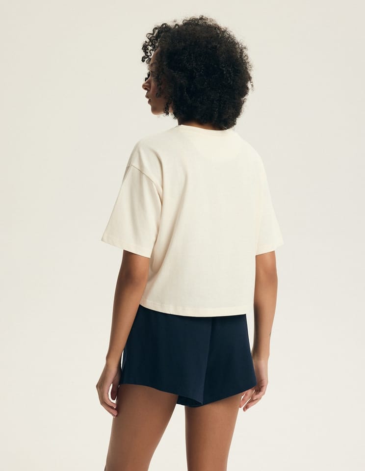 Piżama damska z wysokiej jakości bawełny. Koszulka z krótkim rękawem, półokrągłym dekoltem, luźna i krótka. Spodenki krótsze po bokach, luźne. Zestaw jest idealny na ciepłe noce, oferując pełną swobodę ruchów i komfort snu. Skład: 100% bawełna.