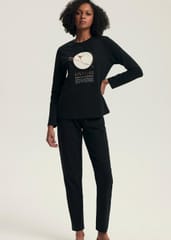 Bawełniana piżama damska z okrągłym dekoltem, przód ozdobiony nadrukiem. Do kompletu długie, jednolite spodnie z wygodną gumką w pasie. Skład: 100% bawełna.