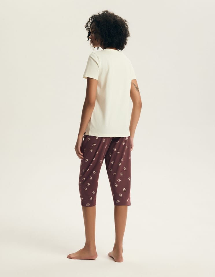 Bawełniana piżama damska, która łączy komfort, jakość i elegancję. Koszulka z krótkim rękawem, z okrągłym dekoltem i grafiką z przodu. W komplecie wzorzyste spodnie 3/4, które zapewniają pełną swobodę ruchów. Skład: 100% bawełna.