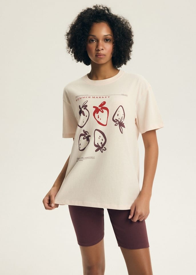 Bawełniana piżama damska, która łączy komfort i elegancję. Koszulka z krótkim rękawem, z okrągłym dekoltem i grafiką z przodu. W komplecie krótkie, dopasowane szorty. Skład: koszulka:100% bawełna, spodenki:95% bawełna.