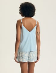 Piżama damska z wiskozy - materiału, który cechuje przewiewność, miękkość i chłonność. Koszulka o luźnym kroju na ramiączkach, spodenki krótkie, wzorzyste, które zapewniają pełną swobodę ruchów i doskonałe dopasowanie. Skład: 100% wiskoza.