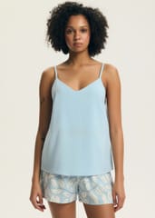 Piżama damska z wiskozy o luźnym fasonie. Koszulka jednolita, na ramiączkach idealnie układa się na ciele. Do kompletu krótkie, luźne spodenki, ozdobione wzorem roślinnym. Skład: 100% wiskoza.