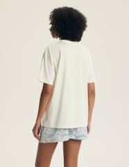Piżama damska o luźnym fasonie. Koszulka jednolita z krótkim rękawkiem, idealnie układa się na ciele. Do kompletu krótkie spodenki, ozdobione wzorem roślinnym. Skład: 100% bawełna.