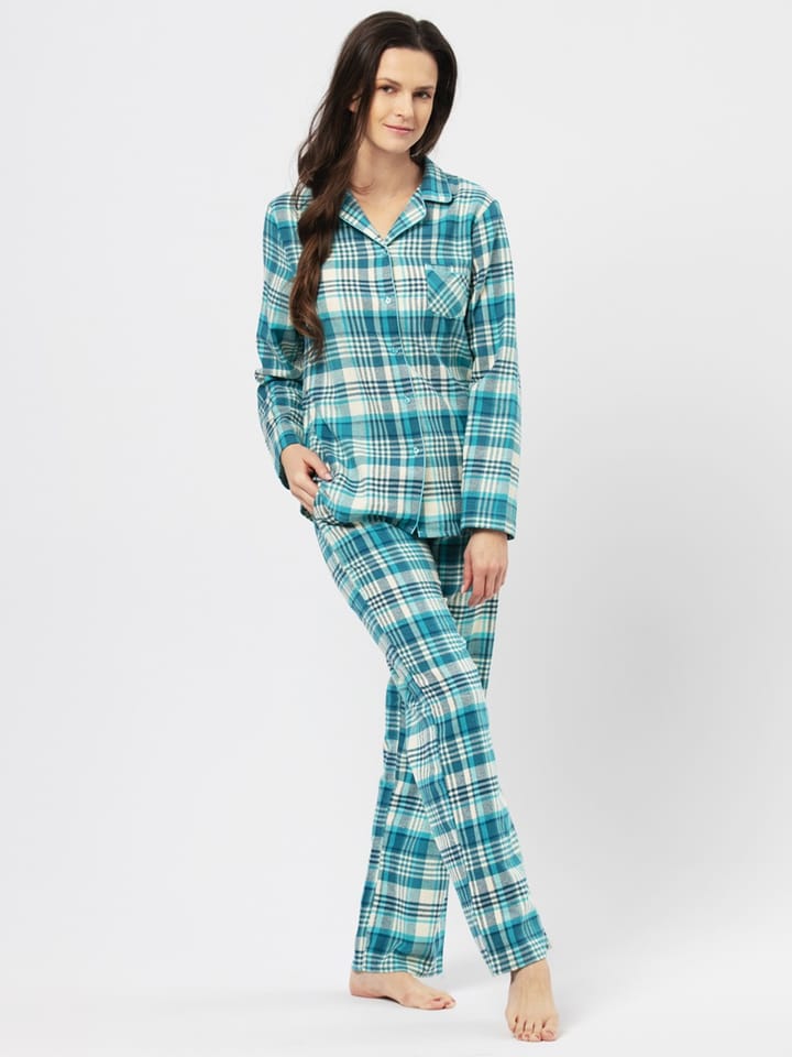Piżama damska z wzorem w kratę. Koszulka z długim rękawem, rozpinana. Spodnie długie z kieszeniami.