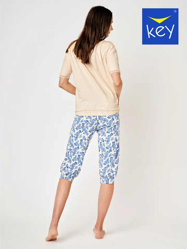 Piżama damska z krótkim rękawem. Bluzka ozdobiona aplikacją, spodenki rybaczki wzorzyste. Skład: 95% bawełna, 5% elastan.