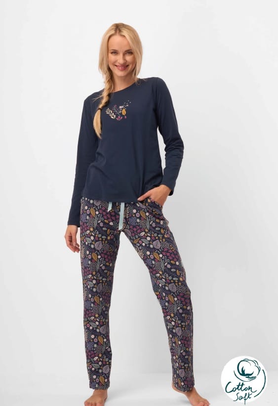 Wygodna piżama damska z prostymi spodniami. Klasyczny krój bluzki z okrągłym dekoltem i delikatnym roślinnym rysunkiem. Wygodne kieszenie boczne i miękka gumka z ozdobną wstążeczką w pasie. Skład: 95% bawełna, 5% elastan