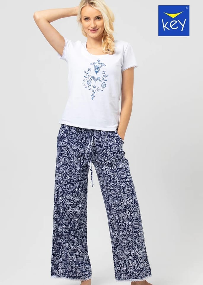 Piżama damska z bawełnianej dzianiny z dodatkiem elastanu. Koszulka z krótkim rękawkiem i nadrukiem na przodzie, krój lekko dopasowany do ciała. Spodnie długie, wzorzyste, z prostą, szeroką nogawką. Skład: 95% bawełna, 5% elastan.
