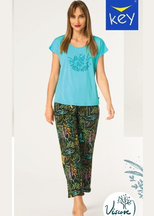 Piżama damska wykonana z wysokiej jakości delikatnej i przyjemnej dla skóry viscosy. Bluzka z krótkim rękawem ozdobiona delikatnym wzorem, spodnie 7/8 wzorzyste, luźne i proste. Skład: 95% viscose, 5% elastan.