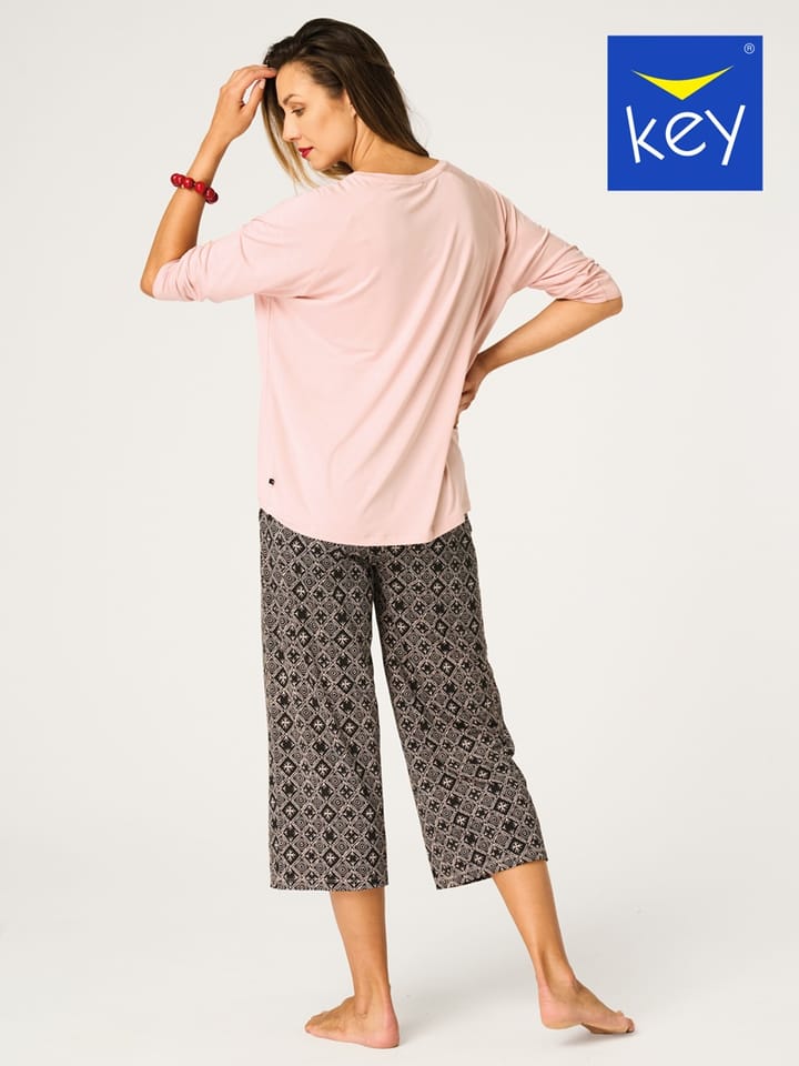 Piżama damska wykonana z wysokiej jakości delikatnej i przyjemnej dla skóry viscosy. Bluzka z rękawem 3/4 ozdobiona delikatnym wzorem, spodnie 7/8 wzorzyste, luźne i proste. Skład: 95% viscose, 5% elastan.