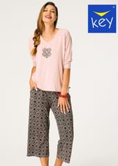 Piżama damska wykonana z wysokiej jakości delikatnej i przyjemnej dla skóry viscosy. Bluzka z rękawem 3/4 ozdobiona delikatnym wzorem, spodnie 7/8 wzorzyste, luźne i proste. Skład: 95% viscose, 5% elastan.