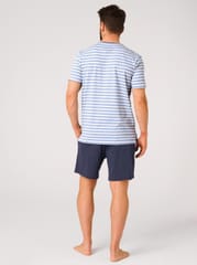 Piżama męska wykonana z wysokiej jakości uszlachetnionej, antyalergicznej bawełny zapewnia doskonałą przewiewność i komfort. Koszulka z krótkim rękawem w cienkie paski i grafiką. Spodenki krótkie, gładkie z wygodnymi kieszeniami. Skład: 100% bawełna.