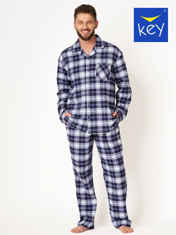 Ciepła i cudownie przyjemna w dotyku piżama flanelowa.Koszula zapinana na guziki z kołnierzykiem i kieszonką na piersi. Spodnie o prostym kroju nogawki, w pasie wygodna, miękką gumę i guziki. Po bokach głębokie, dyskretne kieszenie. Skład: 100% bawełna.
