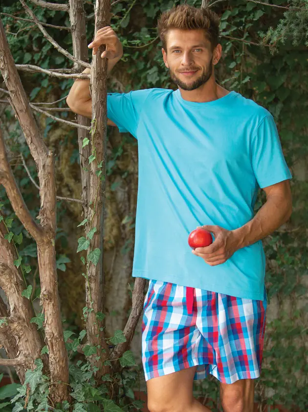 Piżama męska z krótkim rękawem i krótkimi spodenkami. Bluzka gładka ozdobiona delikatną aplikacją. Spodnie wzorzyste. Skład: 100% bawełna