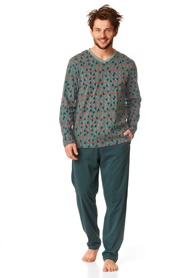 Piżama męska wzorzysta z długim rękawem. Spodnie długie, jednolite z kieszeniami. W pasie wygodna gumka. Skład: 100% bawełna.