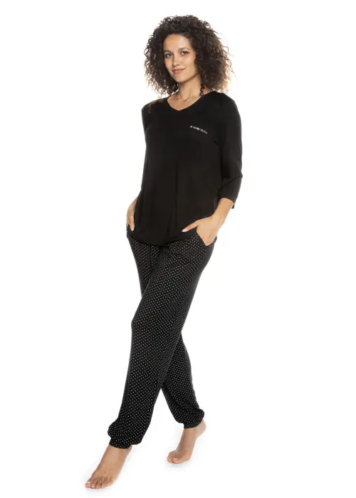 Piżama damska wykonana z dzianiny wiskozowej. Koszulka z długim rękawem, dekolt w kształcie litery "V", zdobiona delikatnym napisem. W komplecie długie spodnie w srebrne gwiazdki, z kieszeniami, nogawki zakończone ściągaczem. Skład: 95% wiskoza, 5%elastan